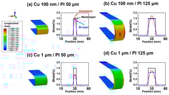 Finite-element method (FEM) modeling and strain distributions: (a) 100 nm thick Cu on 50 μm thick PI, (b) 100 nm thick Cu on 125 μm, (c) 1 μm thick Cu on 50 μm thick PI, and (d) 1 μm thick Cu on 125 μm thick PI.