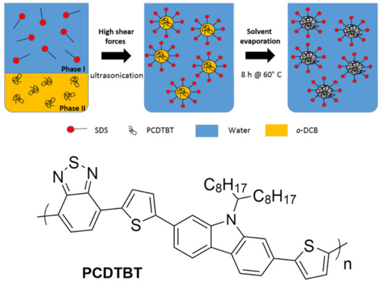 PCDTBT nanoparticles were synthesized by slightly altering the previously reported synthesis procedure using the combined mini-emulsion and solvent evaporation technique in combination with a high-boiling solvent [31]. Different sizes of nanoparticles were obtained by varying the concentration of the dispersed phase. Varying amounts of PCDTBT were dissolved in 2.0 g o-DCB at 80 °C in a nitrogen environment (Table 1). Subsequently, an SDS solution of 11 mg SDS in 2.64 g water (0.4 wt%) was added to the organic phase. After stirring for 1 h, the mini-emulsion was obtained by ultrasonication for 180 s (30 s pulse, 20 s pause) at 60% amplitude using a Branson Mylar 1/8” tip under ice cooling. Immediately after the sonication process, the mini-emulsion was transferred to a round bottom flask with a wide neck and left for 8 h at 60 °C for solvent evaporation. Additional water was added every hour to the emulsion to compensate for the loss during evaporation. The NP samples were washed with Milli-Q ultrapure water as needed to remove the excess surfactant using centrifugal filter devices. The synthesis procedure is summarized in Figure 1.