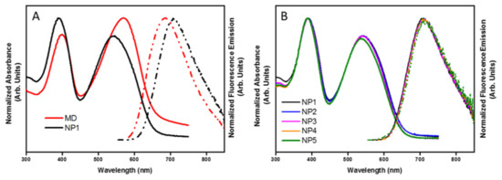 UV-Vis absorption (solid lines) and fluorescence (dashed lines) spectra of (A) PCDTBT in NP (NP1) and MD form, and (B) the differently sized PCDTBT NPs (NP1, NP2, NP3, NP4, NP5). The UV-Vis absorption spectrum of the NPs is hypsochromically shifted and fluorescence spectrum bathochromically shifted, compared to its MD form.