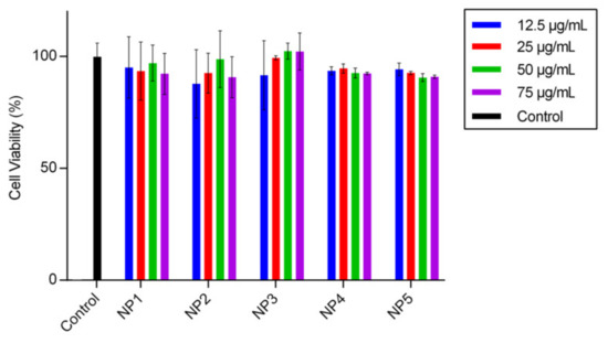 A549 cells were grown in 8 well μ-slides. The cells were subsequently incubated (individually) at 37 °C with 5% CO2, with NP1-5 at a concentration of 50 µg/mL for 18 h. The cells were then rinsed with PBS to remove the free NPs. Two-photon excitation fluorescence microscopy (TPEM) was conducted at room temperature using an LSM 510 META (Zeiss, Zaventem, Belgium) confocal laser scanning microscope (CLSM) on an inverted Axiovert 200 M motorized frame (Zeiss). The microscope was fitted with a LD C-Apochromat 40×/1.1 W Corr UV-VIS-IR water immersion objective. The NPs were excited using a femtosecond pulsed titanium-sapphire laser (MaiTai DeepSee, Spectra-Physics, Santa Clara, CA, USA) tuned to 950 nm. The emission was then routed through a 650 nm low pass filter before being captured using a non-descanned detector (NDD). The images on the transmission channel were also captured on a separate detector mounted to the microscope turret. The internalization of the NPs by the cells was confirmed by acquiring z-stacks over the volume of cells (optical slice thickness = 1 µm).