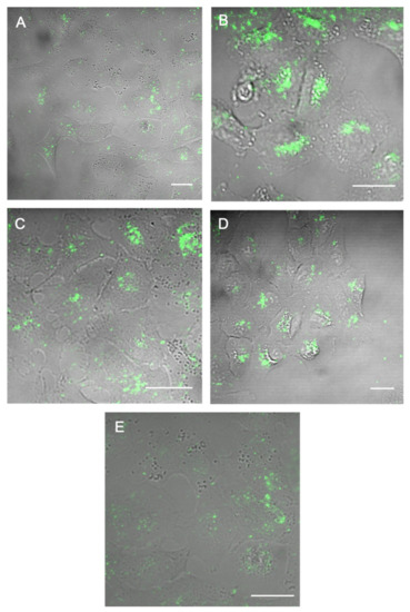Two-photon microscopic images of A549 cells incubated for 18 h with 50 µg/mL of (A–E) NP1–NP5 respectively. The NPs are seen in green; they are superimposed on transmission images of the cells. All the NPs are internalized by the A549 cells. Scale bar: 25 µm.