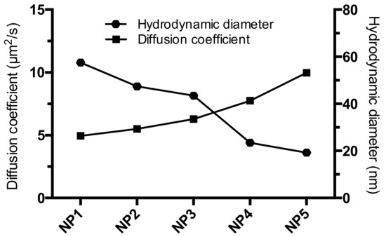 Diffusion coefficients of the different PCDTBT NP samples as measured by RICS. The diffusion coefficients increase as the hydrodynamic size (as measured by DLS) of the particles decreases.