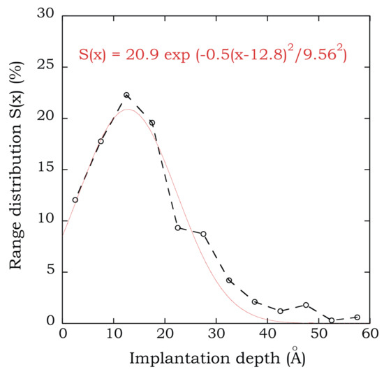 Given a substrate temperature and orientation and a deposition angle , Borovikov et al. [7] showed that an increase of impact energy ( eV), in general, implies a decrease of R and and an increase of L. For , all the atoms were reflected. Low impact energies ( eV), even for small deposition angles, resulted in a reflection coefficient equal to one. They also observed that the dependence of particle/energy reflection coefficients with the incidence angle was non-monotonic, with a minimum at specific angles (e.g., 30–45 for a surface orientation of (100)), a behavior attributed to channeling effects. At low temperatures (∼300 K), L increases substantially at due to the high probability of channeling events [13]. If channeling is absent, the implantation depth distributions can be well described by a Gaussian distribution [13], which, at low impact energies, is truncated at the surface, as shown in Figure 1. More recent works have extended these results by considering additional surface orientations [14], the effects of pre-existing bubbles in W surfaces [15], and curvature effects in W nanoparticles [16].
