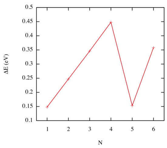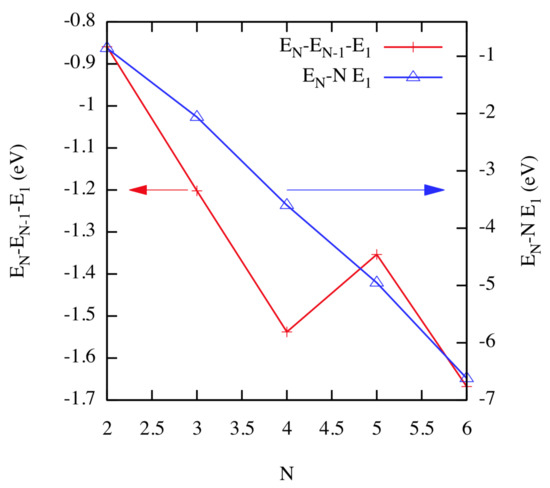 In order to find the most important low-temperature diffusion pathways, Perez et al. [23] performed TAD with low and high target temperatures of 300 K and 600 K, respectively. For a given cluster with size N, their simulations started with the lowest energy structure found for the cluster with size plus one additional He interstitial. Once the two species encountered one another, forming a He cluster with size N, its diffusion was simulated. For each cluster, the lowest energy diffusion pathway, as well as the lowest energy structure was identified. With the exception of the case corresponding to , the ground state structure for all the clusters was found to be composed of He atoms located in tetrahedral interstices. For , the fifth He atom occupies an octahedral interstice; note that there are 24 tetrahedral and 18 octahedral positions within the BCC unit cell. As shown in Figure 2, the strength of the binding of the He cluster increases with the cluster size. If we consider the change of energy after removing a He atom from the clusters, the case corresponds to a local maximum. Density Functional Theory (DFT) calculations [24] show a similar behavior, but with higher values, approximately 30%, as compared to the classical potential used in this work.