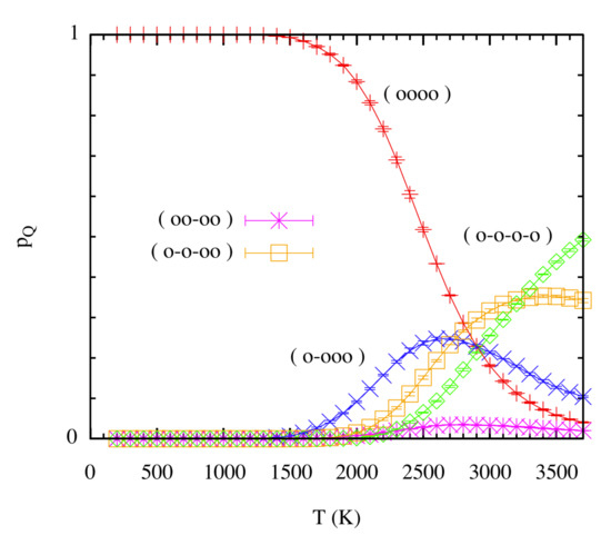 Using STMD and multicanonical simulations, Perez et al. [23] obtained finite-temperature effects on the stability of the clusters, specifically the canonical distributions of cluster compositions for all temperatures, which allowed determining the probabilities of finding certain cluster compositions Q. As an example, the case corresponding to is shown in Figure 3. For temperatures K, the most notable cluster configuration is a cluster containing all four He atoms. With significant probability, single He atoms start to be observed at temperatures above 1500 K. On the other hand, the equilibrium probability of single He atoms becomes vanishingly small at low temperatures. Furthermore, using free energy data, Perez et al. [23] showed that the temperature at which He atoms separate from the clusters, or at which clusters are completely fragmented, grows with N, in accordance with the results obtained at K. Figure 3 also provides a picture of the most probable dissociation scenario as a function of temperature. For instance, approximately between 1500 K and 2700 K, the four-atom cluster most likely transforms to a three-atom cluster plus a dissociated He atom, although the additional dissociation of He atoms starts to be more significant above 2000 K, probably involving intermediate steps. Additional insight is gained when we consider the volume-independent free energy of the clusters, which provides transition points for a given transformation.