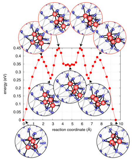 - Henkelman, G.; Jónsson, H. Improved tangent estimate in the nudged elastic band method for finding minimum energy paths and saddle points. J. Chem. Phys. 2000, 113, 9978–9985. [Google Scholar] [CrossRef]