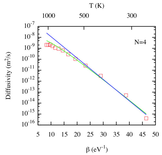 The diffusivity of the different clusters, as a function of temperature, was obtained from the time-dependent Mean Squared Displacement (MSD) via a linear fit. As an example, in Figure 6, we show the results corresponding to (similar behavior is seen for ). For the cluster sizes considered in this study, the main result was the departure from a standard Arrhenius behavior. Additional insight is gained by considering what Perez et al. [23] termed Superbasin Harmonic Transition State Theory (SB-HTST), from which a generalized Arrhenius expression is obtained with an activation energy that becomes a function of temperature. In very good agreement with the MD results, SB-HTST predicts the downward bending of the slope of the Arrhenius curve as the temperature rises, due to the increase in the sampling frequency of higher-lying energy basins.