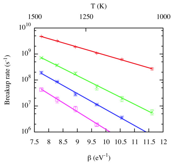 (Color online) Breakup rate as a function of . Red +: ; green ×: ; blue *: ; pink ☐: . Lines correspond to Arrhenius fits. Taken from Perez et al. [23].