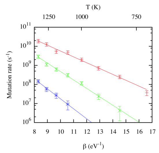 Concerning the trap mutation process, Perez et al. [23] also obtained the mutation rates as a function of temperature, which are shown in Figure 8. The mutation rate increases sharply with size, with a clear Arrhenius behavior over the range of temperatures considered. Other MD calculations [24] also exhibit an Arrhenius behavior, although the values reported for the characteristic times were approximately two orders of magnitude higher. As expected, the larger the cluster, the higher the mutation rate. Further compounding this effect is the fact that mutation is reversible at smaller N, i.e., that the W vacancy and W interstitial can recombine, restoring the He atoms to interstitial positions.