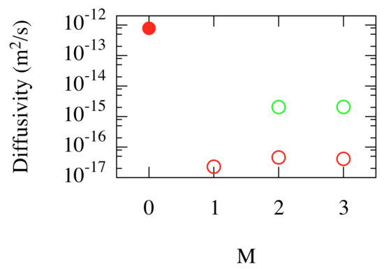 A first striking observation is the effect of a single He atom on the mobility of W vacancies. Perez et al. [34] found that adding a He atom to a single W vacancy () causes the diffusivity to change by at least four orders of magnitude, from ∼ to a value below ∼ (with 90% confidence). Note that previous DFT calculations [35] provided explicit values for the change in migration energy (from 1.81 eV–4.83 eV), which explains the immobilization of the complex on ms timescales. Similar values were obtained for two and three He atoms, as shown in Figure 9.