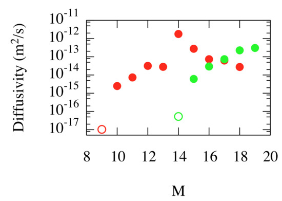 (Color online) Diffusivity of high He content complexes at K as estimated from kinetic Monte Carlo simulations informed by ParSplice simulations. Red: ; green: . Filled symbols correspond to estimates of the diffusivity, while open symbols are upper bounds at a 90% confidence level for cases where the complexes did not diffuse on accessible simulation timescales. Taken from Perez et al. [34].