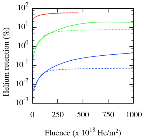 (Color online) He retention as a function of fluence. Red: ; green: ; blue: . Continuous and dashed lines correspond to immobile and mobile complexes, respectively. Taken from Perez et al. [34].