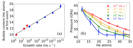 Successive incorporation of He atoms in a bubble increases its pressure, which is the driving force for nucleation of Frenkel pairs, as has been shown by standard MD simulations [36]. The nucleation of Frenkel pairs increases the bubble size and partially releases the pressure in the bubble. Prismatic dislocation loops, formed by the aggregation of W interstitials, are emitted from the bubble. Sandoval et al. [37] observed clear kinetic differences as a function of the growth rate. For instance, the first detected event (the nucleation of a Frenkel pair) required fewer He atoms at slower growth rates, as shown in Figure 12a.