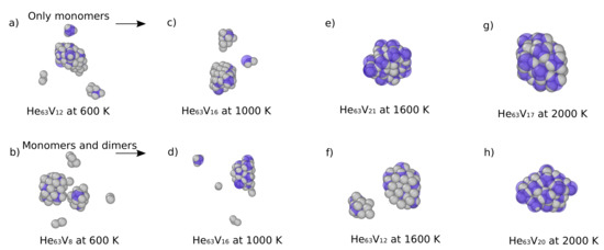 Including the diffusion process of He clusters to study the growth process of He bubbles adds interesting aspects to the simulation results, as shown by Sandoval et al. [48]. He monomers and dimers were introduced in a simulation box thermalized at different temperatures in the range [600, 2000] K. After nucleation of an initial He bubble and a W interstitial (crowdion) via self-trapping, incoming He clusters were allowed to diffuse freely and interact with them. The simulations showed that incoming He atoms strongly interact with the crowdion structure developed around a bubble, either impeding their incorporation into the bubble or even trapping them. If an He atom remains trapped in the crowdion structure for a sufficiently long time, it can eventually be joined by a newly-inserted He atom, forming a dimer. Sandoval et al. [48] also showed that the interaction with a He dimer is stronger, as compared to single He atoms. The simulations revealed that if the He-dimer, already trapped in the crowdion structure, captured two additional He atoms, the nucleation of a new He bubble via self-trapping was highly probable. Subsequently, as new bubbles grow, more crowdions are generated, which, in turn, can capture additional He atoms. A network of He (nano-)bubbles is formed, which is strongly dependent on the temperature, as shown in Figure 14. High temperatures reduce the probability that He atoms would remain trapped by the crowdions long enough to facilitate the nucleation of new He bubbles. Furthermore, at low He fluxes the trapped clusters would likely have time to de-trap from the crowdion structures, which affects the formation of the network.