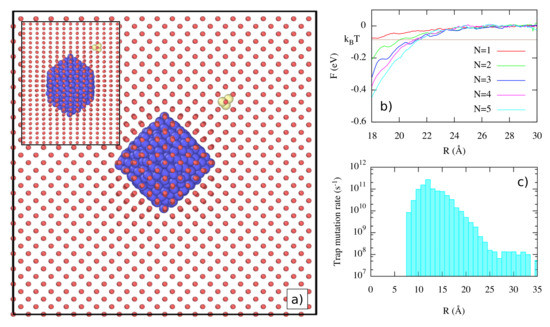 Now, we extend the observations considered in the previous section to include the interaction between pre-existing bubbles and He clusters. Perez et al. [49] characterized the thermodynamics and kinetics of these interactions, showing that, in addition to attracting clusters, He bubbles also enhance the probability of trap-mutation in their neighborhood. In Figure 15a we show the simulation setup used by Perez et al. [49]. In a cubic simulation box containing 16,000 W atoms, a rhombic dodecahedral bubble with (110) facets was constructed by creating a void of 175 W vacancies, which was subsequently filled with 481 He atoms (in the original paper [49], the bubble geometry used was incorrectly described). The system was equilibrated at a temperature of K. Previous MD simulations indicated that the internal pressure was 26 GPa, a typical value for a growing bubble that has just released a dislocation loop. In addition to the large bubble, individual (N = 1–6) clusters are introduced in the simulation cell.