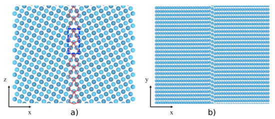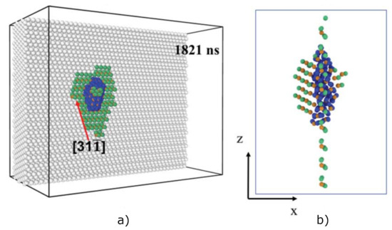 Recently, Liu et al. [50] studied the process of He-bubble nucleation and growth in the neighborhood of a tilt GB. This GB possesses a well-ordered structure, stable at temperatures typical of a fusion environment (1000 K in that work), as shown in Figure 16.