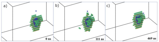 In a second set of simulations, Liu et al. [50] evaluated the effect of the W interstitial halo on the arrival of a diffusing He atom. Snapshots corresponding to these simulations are shown in Figure 18. It was observed that the W halo attracts the incoming He atom, but prevents it from reaching the bubble, which suggests that the W halo may limit the diffusion of He atoms into the bubble, affecting the bubble growth process. This hypothesis was further supported by directly computing the diffusion barriers for He using climbing-image nudged elastic band calculations [25,51].
