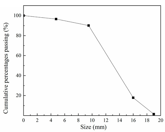 The fine and coarse aggregates were river sand and crushed rock, respectively. The maximum size of fine and coarse aggregate were 4 mm and 22 mm, respectively. The packing densities of fine and coarse aggregate were 1342 kg/m3 and 1479 kg/m3. The apparent densities of fine and coarse aggregate were 2381 kg/m3 and 2632 kg/m3. Figure 1 shows the particle size distribution of coarse aggregate.