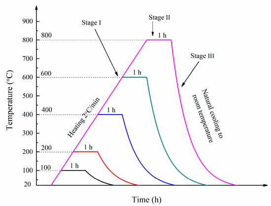 A number of samples were exposed to five different temperatures, namely 100, 200, 400, 600 and 800 °C after curing for 90 days in room temperature. In stage I, the furnace temperature was increased from room temperature to the target temperature at a heating rate of 2 °C/min. In stage II, the target temperature was maintained for. In stage III, the furnace was turned off to allow the specimens to cool down to ambient temperature naturally. The heating regimes used in this study are presented in Figure 3.