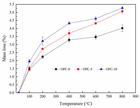 The percentage of mass loss after exposure to elevated temperatures were presented in Figure 4. It can be seen from Figure 4 that the percentage of mass loss increased with the increases of temperature and the cement content. It is observed from Figure 4 that the rate of mass change slowed down after 200 °C, indicating that the mass loss mainly occurred before 200 °C. The mass loss occurred within this temperature range accounted for more than 50% of the total mass loss.