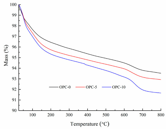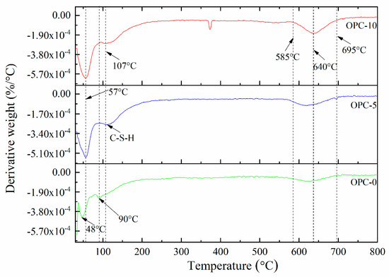 The mass loss between 200 and 400 °C is attributed to continuous dehydroxylation of N-A-S-H gel [28] and C-S-H [25,29]. This is consistent with the information presented in Figure 5 that the mass loss rate of OPC-0 was constant between 200 °C to 400 °C. At the same time, the loss of interlayer water in pores of N-A-S-H as well as to the first stage of dehydroxylation makes contributions to the mass loss occurred within this temperature range. It is similar to the explanation proposed by several authors [30,31,32] when they investigated cement-based concrete. Additionally, the mass loss of OPC-5 and OPC-10 occurred within this temperature range is also resulted from the dehydration of C-S-H. As can be seen from the DTG curve of OPC-0 (Figure 6), the mass loss occurred in the range of about 585 °C to 695 °C is associated with the dehydroxylation of OH groups, such as sodium-based geopolymers. But the dehydroxylation of OH groups made a very little contribution to the mass loss of OPC-5 and OPC-10 samples within this temperature range. The mass loss of OPC-5 and OPC-10 was mainly induced by the decomposition of Ca(OH)2 in this temperature range. The DTG diagram implied that much more Ca(OH)2 was produced in FAGC containing 10% cement. Finally, the mass loss rate stabilized again after 695 °C, which can be seen from Figure 6.