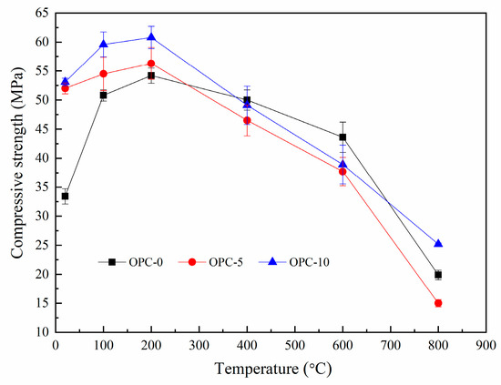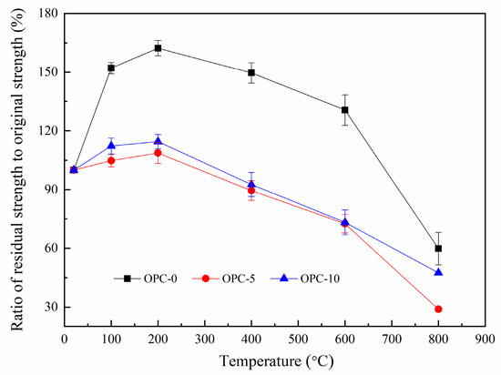 The ratio of residual compressive strength to original compressive strength is illustrated in Figure 8. The ratios for OPC-0, OPC-5 and OPC-10 are about 167%, 103%, and 114% respectively at 200 °C and the values are about 60%, 29% and 48% respectively at 800 °C. These residual strengths are higher than those usually found for cement-based concrete [38] and heat-cured fly ash-based geopolymer concrete [18].