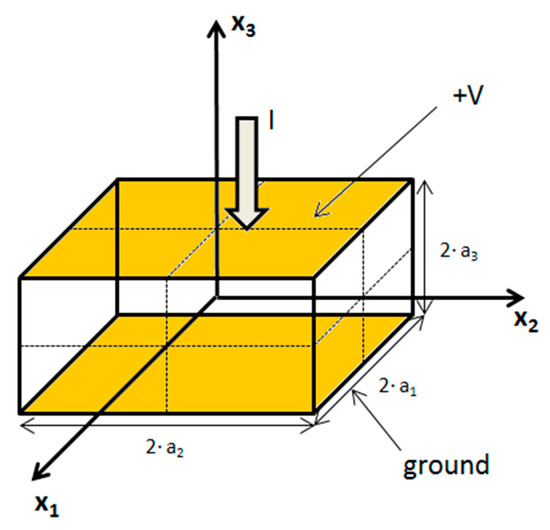 Consider a single crystal of any piezoelectric crystal class with a given stiffness, piezoelectric, and permittivity matrix. We assume, for sake of argument, that the sample is a rectangular cuboid in an orthonormal basis defined with three vectors , , , as shown in Figure 1, although in principle the model can accommodate any sample geometry. The symbols used to describe the model are summarized in Table 1. The dimensions of the piezoelectric material are 2·a1 along x1 axis, 2·a2 along x2 axis and 2·a3 along x3 axis. Two electrodes are on two parallel faces. Arbitrarily, the electrodes are assumed on faces normal to the x3 axis. They are assumed to be ideal conductors with a relative potential V on the top electrode and zero on the bottom electrode. The current I is defined in receptor convention between the electrodes. The sample is assumed mechanically free on its six faces.
