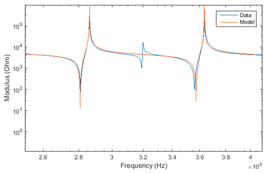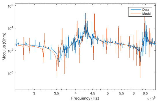 The model was analytically resolved using Matlab on an Intel® Core™ i5-4300U processor for LiNbO3 in less than one hour. Once analytically resolved, numerically evaluating the analytical model to extract the material parameters from any given impedance spectrum was then realized in under 0.2 s. This compares favorably to conventional numerical models that can take hours or days to resolve on the same processor, depending on the complexity of the numerical model selected (e.g., FEA, equivalent circuit analysis, etc.). The apparent noise visible in the impedance spectrum at high frequency is the result of numerous small resonances. Indeed, the densities of resonances increase with the frequency, due to harmonics. As shown in Figure 2, the analytical model (using complex piezoelectric parameters, as discussed above, to take into account loss mechanisms) is able to accurately fit the experimental data over a wide frequency range. The accuracy is therefore comparable or better than the most onerous and complex conventional numerical models.