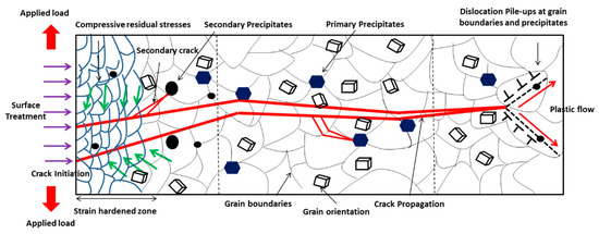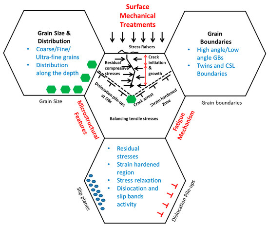 - Grain Distribution: Surface nanograin structure strengthens the material while interior coarse grains maintains the ductility of the material. The hard-and-deformed nanograined surface structure suppresses the crack initiation while the soft coarse-grain interior structure is effective in arresting the cracks [53]. Strain delocalization in gradient nanostructure is responsible for enhancing fatigue resistance in cyclic loading/unloading.