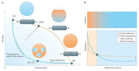 - Wu, X.L.; Jiang, P.; Chen, L.; Zhang, J.F.; Yuan, F.P.; Zhu, Y.T. Synergetic strengthening by gradient structure. Mater. Res. Lett. 2014, 2, 185–191. [Google Scholar] [CrossRef]