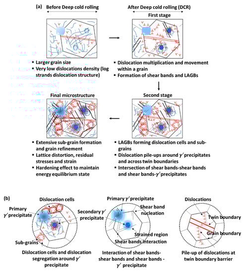 - Kumar, D.; Idapalapati, S.; Wang, W.; Bhowmik, A. Microstructural characteristics and strengthening mechanisms in a polycrystalline Ni-based superalloy under deep cold rolling. Mater. Sci. Eng. A 2019, 753, 285–299. [Google Scholar] [CrossRef]