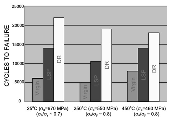 - Altenberger, I.; Nalla, R.K.; Sano, Y.; Wagner, L.; Ritchie, R.O. On the effect of deep-rolling and laser-peening on the stress-controlled low- and high-cycle fatigue behavior of Ti-6Al-4V at elevated temperatures up to 550 °C. Int. J. Fatigue 2012, 44, 292–302. [Google Scholar] [CrossRef]