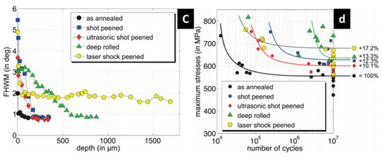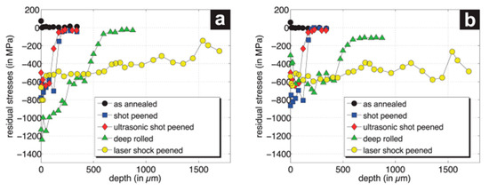 - For surface treatments, LSP shows relatively high fatigue performance and deeper residual stress as compared with SP, USSP, WJCP, and DCR for the studied process parameters. However, the same input energy, coverage, and material is required for a better comparison of the processes and performance. Hybrid processes like shot peening followed by deep cold rolling could be beneficial for the fatigue life, as a high magnitude of compressive residual stress deeper in the material can be achieved.