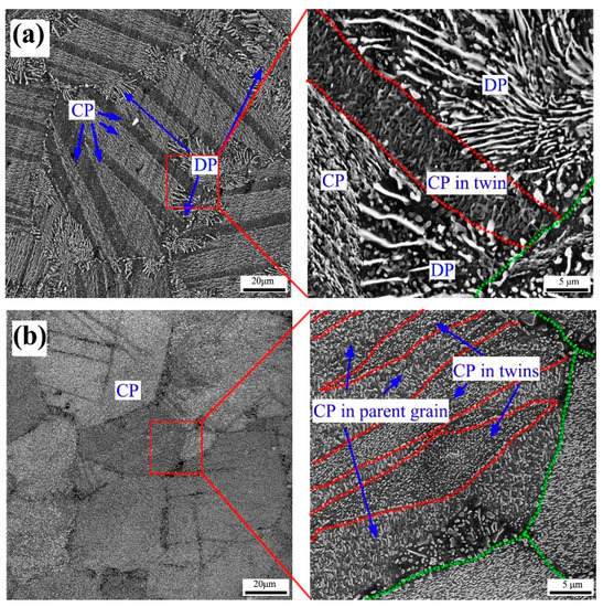 Mg-Al alloy systems are the most widely used of Mg alloys. The addition Al element not only improves castability, but it also enhances strength and ductility of Mg alloys at room temperature. Generally, Mg17Al12 phase is main precipitates in the Mg-Al alloy systems with high Al content (e.g., AZ91, AZ80, and AZ61, etc.). It usually has a plate-like morphology on the basal plane with a Burgers orientation relationship with the matrix (i.e., (0001)α//(011)β and (2-11-0)α//(11-1)β) [6]. The Mg17Al12 precipitate has two types of distribution states: coarse discontinuous precipitates (DP) and fine continuous precipitates (CP) [28,41], as shown in Figure 1a. The two types of precipitates usually simultaneously occur and compete each other. Fine continuous precipitate is generally believed to provide the major age-hardening effect in Mg-Al based alloys [28]. Thus, promoting continuous precipitates and regulating their size and density are key in raising the age-hardening effect of the Mg-Al alloy systems. It has been reported that the precipitation type is dependent on the dominated diffusion mechanism during aging [41]. When the grain boundary diffusion process dominates, the discontinuous precipitates are favored, and continuous precipitates are formed when the volume diffusion becomes faster. Cold deformation can generate a high density of crystal defects within grains, which can promote the volume diffusion during aging. Thus, cold deformation could remarkably influence the precipitation behavior of the Mg-Al alloy systems.