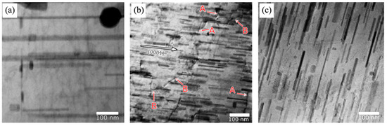 Transmission electron micrographs of β′1 rod-shaped precipitates in the peak aged condition of an extruded Mg-Zn-Y alloy, showing β′1 precipitates viewed normal to the hexagonal axis of magnesium for (a) 0%, (b) 3%, and (c) 5% pre-aging strain. Dislocations are visible in the foil given 3% strain (b). Segments of dislocations that are parallel to the basal plane are labelled “A” and segments of dislocations that lie at an angle to the basal plane are labelled “B” [52].