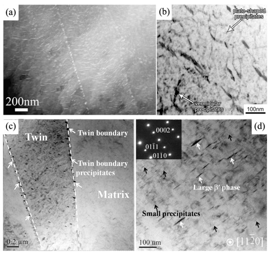 TEM micrographs of various samples (a) extruded Mg-4Sm alloy subjected 20% cold rolling and aging [37], (b) the Mg−2.7Nd−0.4Zn−0.5Zr alloy with a pre-compressive strain of 8% and subsequently aged at 200 °C or 8 h [35], (c,d) are the twin boundary precipitates and matrix interior precipitates in the pre-deformed WE43 alloy, respectively [24].