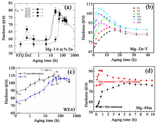 The aging hardness curves of pre-strained alloys. (a) Extruded Mg-3.0at.%Zn alloy (pre-tensile strain along extrusion direction (ED)) [55], (b) as-cast Mg-7.68Zn-1.68Y alloy (pre-compression) [65], (c) as-cast WE43 alloy (pre-cold forging) [24], and (d) extruded Mg-4Sm alloy (pre-cold rolling) [37].