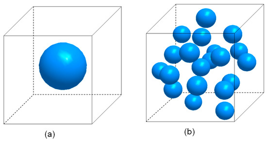 The representative volume element (RVE) of the raw silica-reinforced nanocomposites are shown in Figure 2. One spherical rigid particle is placed at the centroid of a cube in the single-particle model (Figure 2a). The multi-particle model, containing a random dispersion of 20 non-overlapping identical spheres, is shown in Figure 2b. The random particles were generated using a constrained adsorption algorithm [18]. Subsequently, the matrix and particles are meshed with the tetrahedral element, and the zero-thickness 6-node three-dimensional cohesive element (COH3D6) is inserted between the particles and matrix to simulate the interfacial debonding. The numbers of elements of the single-particle and multi-particle model are approximately 197,400 and 371,300, respectively.