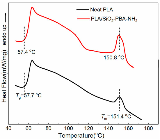 Differential scanning colorimetry (DSC) thermograms of neat PLA and PLA/SiO2-PBA-NH2 nanocomposite.