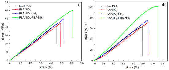 The tensile and flexural stress–strain curves of neat PLA and nanoparticle-reinforced PLA composites are shown in Figure 5, and associated properties are tabulated in Table 1. The toughness was calculated by integrating the tensile stress–strain curves. It can be seen that the neat PLA and nanocomposites exhibit brittle fracture behaviors. Notably, as can be seen in Figure 5a,b, both the strength and failure strain of PLA significantly improve as the core–shell nanoparticles are introcuced. As can be seen in Table 1, in comparison with neat PLA, the tensile strength of PLA/SiO2-NH2 and PLA/SiO2-PBA-NH2 are enhanced by 17.6% and 36.9%, respectively, which are much higher than that of PLA/SiO2 of 4.2%. This could be attributed to the perfect interfacial interactions between the nanofillers and matrix to promote effective stress transfer. Moreover, the core–shell nanoparticle also has a significant effect on improving the ductility of PLA, increasing its elongation at break by 25.9%.