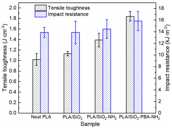 Furthermore, the core–shell nanoparticle also exhibits a remarkable toughening effect on PLA, as shown in Figure 6. With the incorporation of SiO2-PBA-NH2 nanoparticles, the toughness of the PLA nanocomposite improves 80.4% in comparison with that of neat PLA. This may result from the good interfacial adhesion and the crack tip pinning effect. Moreover, from the Figure 6, the impact strength of the PLA/SiO2-PBA-NH2 nanocomposite is improved to 15.85 kJ·m−2 from 13.88 kJ·m−2, an increment of 14.2%, with only 1 wt. % loading of the core–shell nanofiller. The other rigid nanoparticles show nearly no enhancement of the impact resistance of PLA. This indicates that the insertion of a flexible PBA layer can absorb more impact energy.