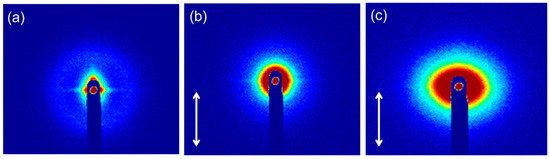 Two-dimensional small-angle X-ray scattering (SAXS) scattering patterns of (a) neat PLA before tensile testing, (b) PLA/SiO2 and (c) PLA/SiO2-PBA-NH2 after tensile testing (the double-headed arrows indicate the tensile direction).
