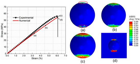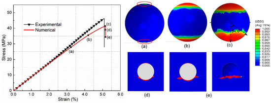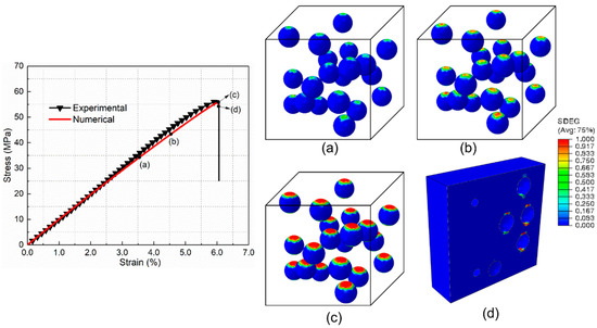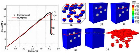 For comparison with the core–shell particle-reinforced composite, the mechanical behavior and damage process of composites incorporated by the raw silica are investigated first. Figure 9 shows the tensile stress–strain curves of raw silica-reinforced composite obtained by the experiment and numerical simulation. It can be seen that the numerical result is in good agreement with the experimental results. The damage initiation and evolution process of PLA/SiO2 under uniaxial tension are presented in Figure 9a–e (SDEG, scalar stiffness degradation variable). Figure 9a illustrates that the main damage mechanism at maximum stress is interfacial debonding. Each particle debonds from the surrounding matrix. After the interface debonding, the maximum microscopic hydrostatic stress concentrates mainly at the tip of the debonding zone, which induces matrix cracking (Figure 9b). Then, the matrix cracking propagates to the nearby debonding particles and extends in the matrix, as presented in Figure 9c,d. Finally, as can be seen from Figure 9e, the interfacial debonding at different locations is linked by the matrix cracks throughout the whole RVE, which causes the ultimate failure of the composite.