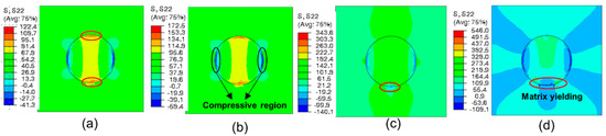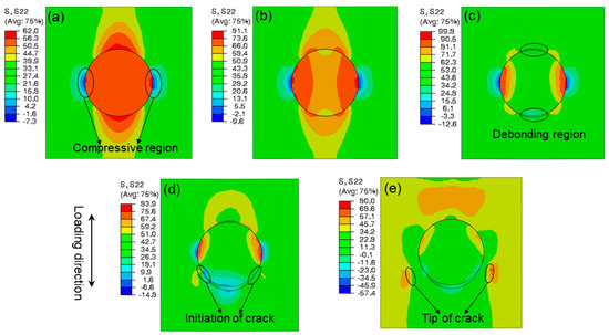 Figure 11 presents the stress distribution of the single-particle model in the tensile direction. It can be seen from Figure 11a that, under tensile loading, the rigid silica with a high modulus has a primary load-bearing capacity. The maximal tensile stress of the material is concentrated in the polar zones along the loading axis. As the tensile stress in the interface increases to the interfacial strength, the interfacial debonding initiates. Meanwhile, the compressive regions appear in the equator perpendicular to the loading direction. In addition to stretching, the interfacial debonding proceeds from the polar zone to the equator (Figure 11b). As the interfacial debonding ceases, resulting from the impediment of compressive stress, the load-bearing capacity of the rigid particle begins to decline, which results in the tensile stress of the whole model reaching its maximum, and cavities appear at the polar zones (Figure 11c). Subsequently, as the cavities extend to the equator, the maximal microscopic tensile stress in the matrix concentrates at the tips of cavities. When this tip proceeds to the compressive stress region, matrix cracking is initiated, as presented in Figure 11d. Eventually, owing to the prevention of front compressive stress, the matrix crack propagates along the direction perpendicular to the tensile axis (Figure 11e), and the stress in the tip of crack stays at maximum.
