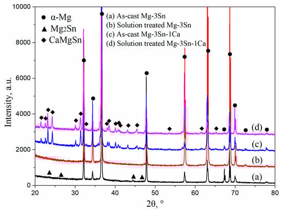 - The Mg2Sn phases of Mg-3Sn alloy were decomposed in the α-Mg matrix, and the microstructure of Mg-3Sn-1Ca alloy remained essentially unchanged after solution treatment for 28 h at 733 K, suggesting that the thermal stability of the CaMgSn phase is evidently higher compared to that of the Mg2Sn phase.
