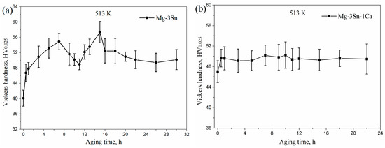 - The Mg-3Sn alloy exhibited double age-hardening peaks. The microhardness increased to a first peak value of 54.9 ± 2.1 HV at 7 h with the increase in aging times. After a slight decrease, the microhardness increased again to a second peak value of 57.4 ± 2.8 HV for 15 h. The microhardness of aged Mg-3Sn-1Ca alloy quickly reached a stable value with the increasing aging times due to the no change of CaMgSn phases.