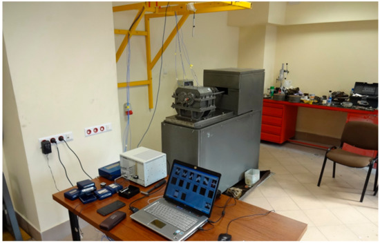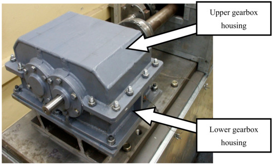 An FZG power circulating test stand (Power Transmission Systems Laboratories at the Faculty of Transport, the Silesian University of Technology, Katowice, Poland,) was selected for testing gearbox housings made of various materials. This stand (Figure 1) is equipped with a gear and allows experiments to be carried out, among others, with the use of various gearbox housing design solutions. Examples of results of research conducted on the stand were published in papers [35,37,45]. The upper part of the gearbox housing is an interchangeable element in this study. The subject of the study is the assessment of the influence of various materials used in the housing on its vibroactivity and weight.