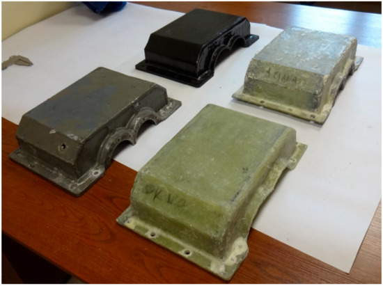 Two composite materials reinforced with glass fibre, with different forms of reinforcement: fabric and a chopped strand mat were selected for the tests. These types of reinforcement represent two extreme reinforcing models for a shell-shape element that is isotropic and orthotropic. Assuming a constant geometry of the product, this resulted in a difference in basis weight and the number of layers. ESTROMAL 14 LM polyester resin with METOX 50 catalyst (LERG, Pustkow, Poland) was used as the matrix for these composites. The bodies were made manually with a vacuum bag; the description of their manufacture is included in the paper [56]. The third composite was reinforced with an 800 g/m2 carbon fabric with an epoxy resin matrix. The product was formed using an autoclave technique from DELTA PREG’s (Italy) prepregs. The material description of the manufactured housings is provided in Table 1. Carbon fiber composite laminates formed in an autoclave can be applied for responsible elements. The form of fabric enables some comparison with the glass fiber composite.