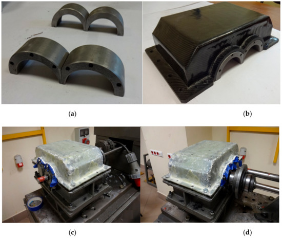 In order to make it possible to fit the manufactured composite housings on the stand, bearing nodes made of steel St3 were glued into them. Bearing nodes were not made of composites at the presented stage of the tests due to the need to ensure the safety of the structure; this is mainly about the transfer of dynamic stresses from bearings and shafts. Attempts to make such elements out of composites are scheduled for further stages of the research. The view of the bearing nodes before mounting is shown in Figure 3a,b. In order to make sure that the housings were properly pressed against bearing nodes and ensure the parallelism of axes, the gluing process was performed directly at the stand, an example of which is shown for K_1 housing in Figure 3c,d.