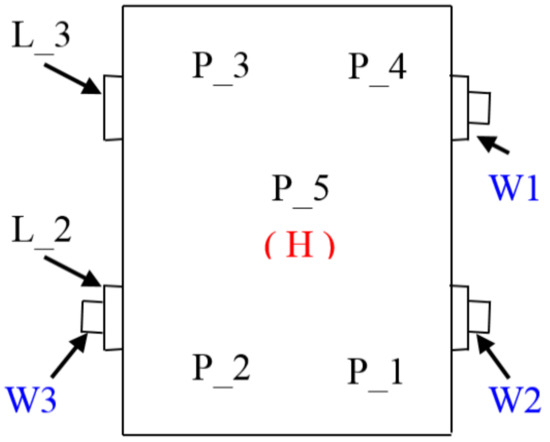 Vibroactivity tests were carried out on the measuring stand shown in Figure 5 and Figure 6. In the experiment, impulse induction was applied with a pulse hammer equipped with a force transducer, five piezoelectric transducers to record the normal vibration acceleration of the upper plate of the housing, and a directional microphone positioned 0.5 m from the upper cover of the housing. Impulse induction with a modal hammer was applied in the immediate vicinity of P_1–P_5 measuring transducers. During the working measurement, induction was applied via shafts W2 and W3 (Figure 4). This made it possible to obtain characteristics of natural and mutual vibration, as well as the function of the transition between the vibration excitation points and the measurement points located on the upper plate of the housing.